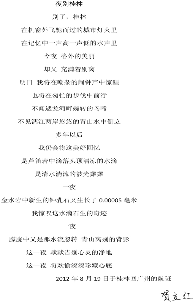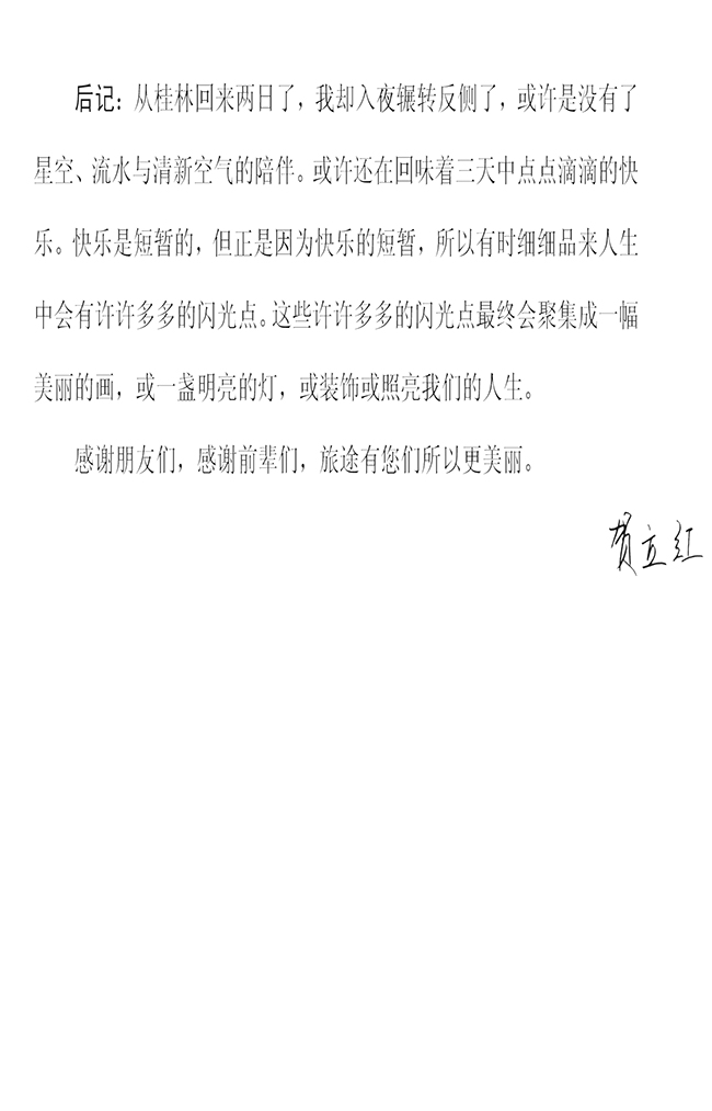 生活需要沉淀,生活更需要激情。回顾历史的长河,我们在遗迹里找到沉淀;品尝现实生活的千姿百态与城市喧嚣,我们更需要激情去劈风斩浪。桂林之旅,我们感受到了历史的变迁,也感受到了属于生活的那份宁静,正如前人所述:“梦里仙境心意遐,水墨奇峰舟为家。品山品水品生活,漓江山水一道茶。”