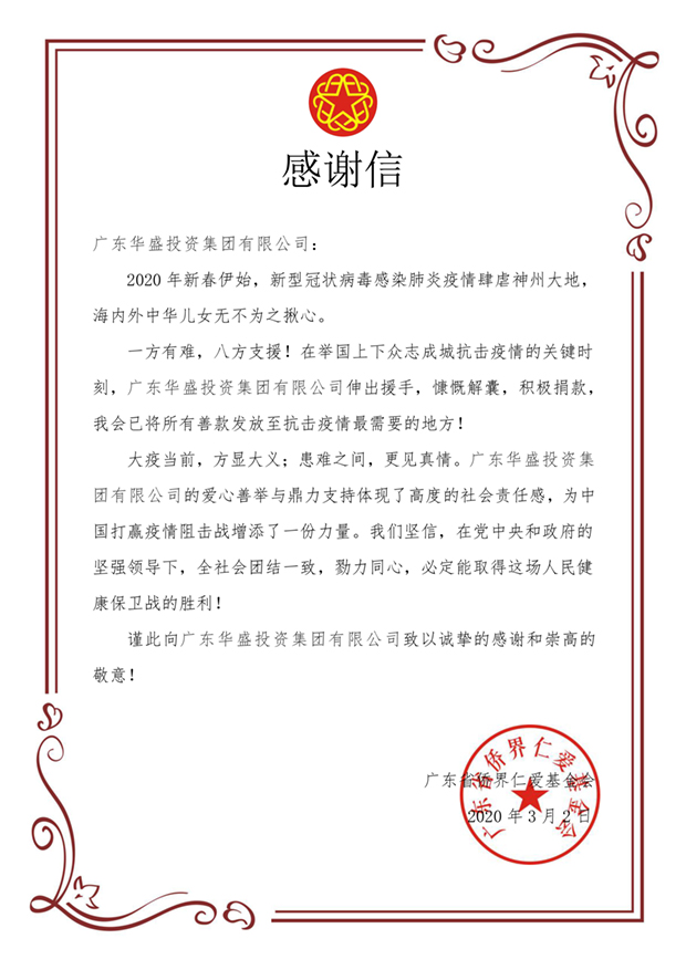 近日。新型冠状病毒感染肺炎。引发的疫情牵动着每个中华儿女的心。2020年1月27日,广东省侨联和广东省侨界仁爱基金会发出驰援抗击疫情的倡议,集团董事长郑继坤先生、总经理郑林栋先生即以广东KY开元官网集团设立的“侨爱南粤·添一基金”名义捐赠10万元,助力抗击疫情,表达企业应有的社会责任。